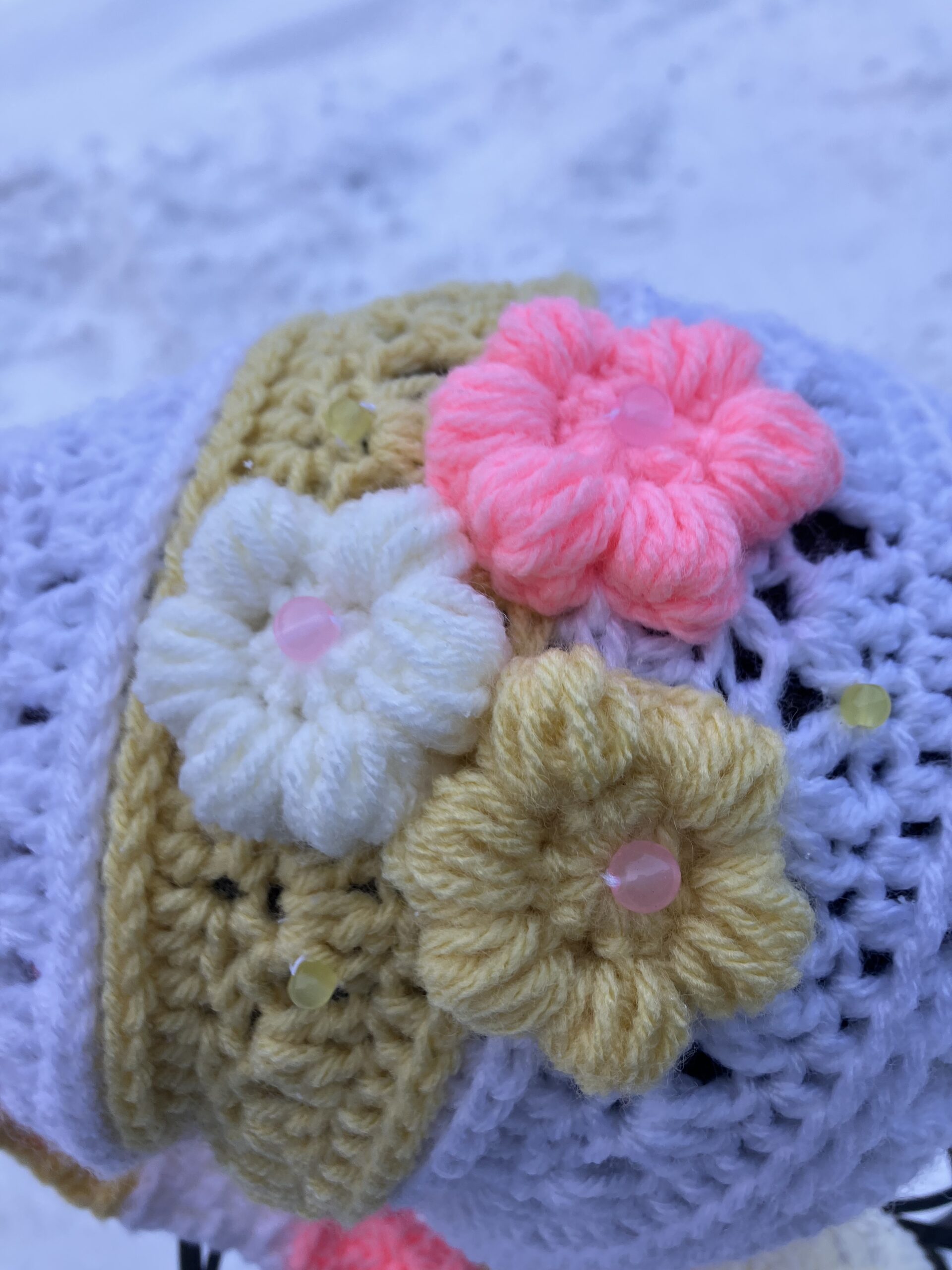 Woman’s handmade stocking hat with flower and bead accents. White, yellow and pink. Fits standard size head.