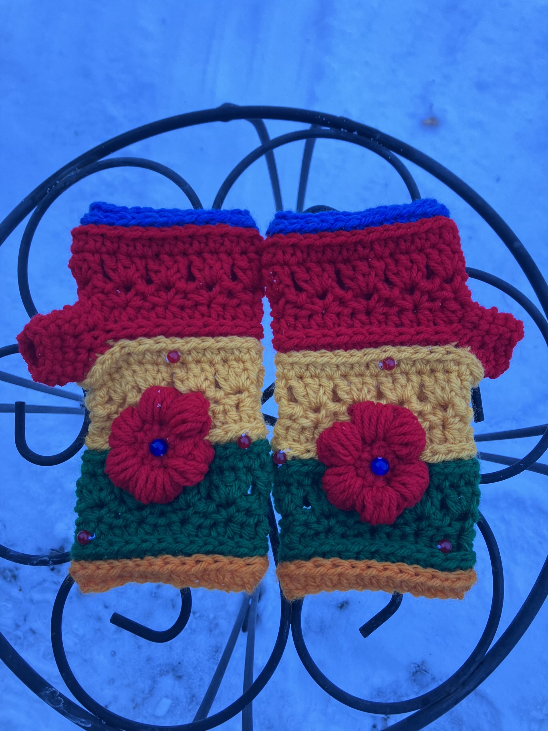 Woman’s handmade fingerless gloves. Green, yellow and red. Flower and bead accents.